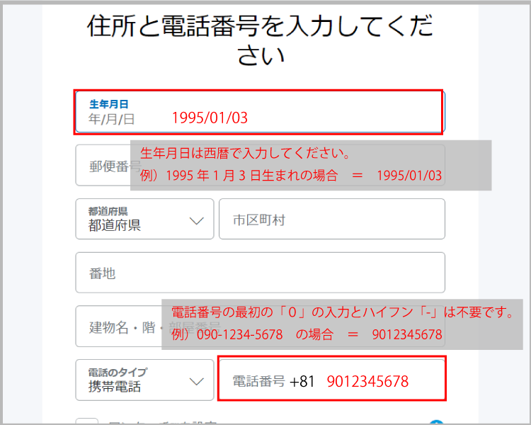 ・生年月日は西暦で入力をしてください。また1ケタの月の場合は頭に「0」が必要です。